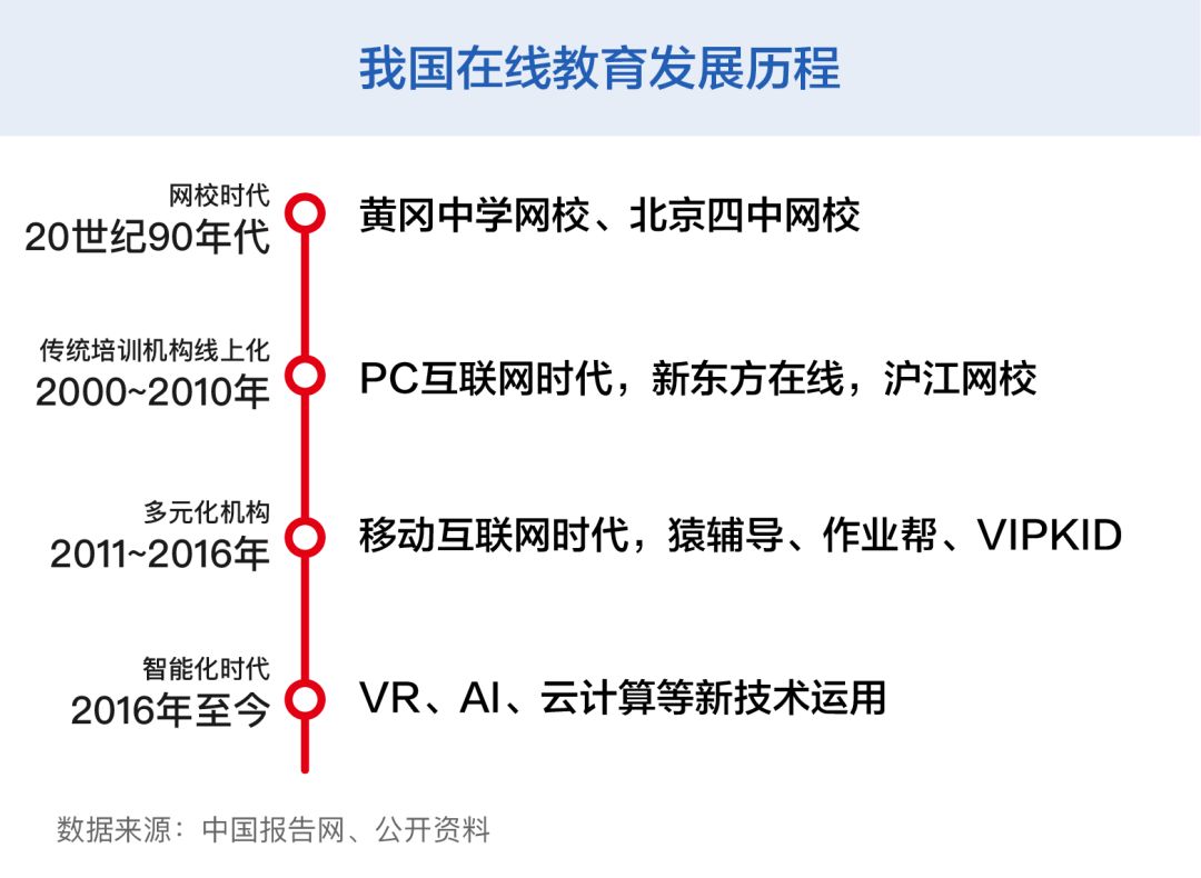 在線教育并不是什么新鮮事。20世紀90年代末,互聯網進入中國。當時黃岡中學、北京四中等名校開辦的網絡學校拉開了中國網絡教育的序幕,“互聯網+教育”模式得到認可。