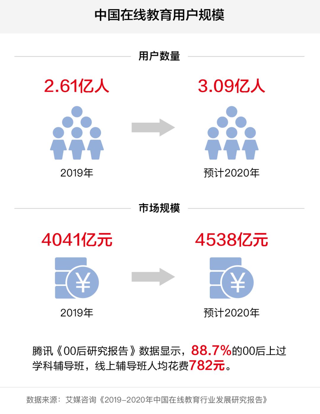 據艾傳媒咨詢《2019-2020中國在線教育產業發展研究報告》顯示,2019年中國在線教育用戶規模達到2.61億,市場規模達到4041億元。預計2020年中國在線教育用戶規模將達到3.09億。市場規模將達到4538億元,同比增長15.5%;騰訊《00后研究報告》顯示,88.7%的00后學生參加過學科輔導班,在線輔導班平均費用為782元。